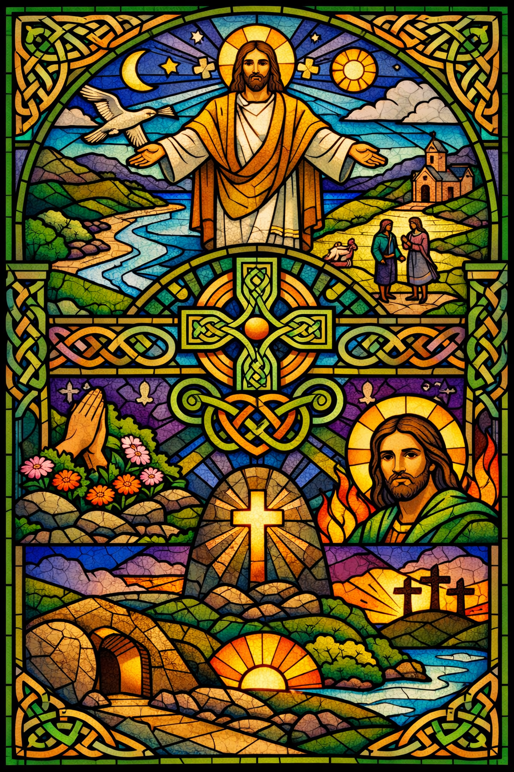 Description of the image. A vibrant stained-glass artwork depicting Jesus with arms outstretched beneath a sun and crescent moon, surrounded by a pastoral landscape with a river, hills, and a small church. A dove flies nearby, and two figures stand together in the distance. A large Celtic-style cross with intricate knotwork sits at the center. Below are scenes of praying hands with flowers, a glowing cross on a hill, three crosses at sunset, and an open tomb at sunrise. The design features rich jewel tones—greens, blues, golds, and purples—with ornate Celtic patterns framing the composition.