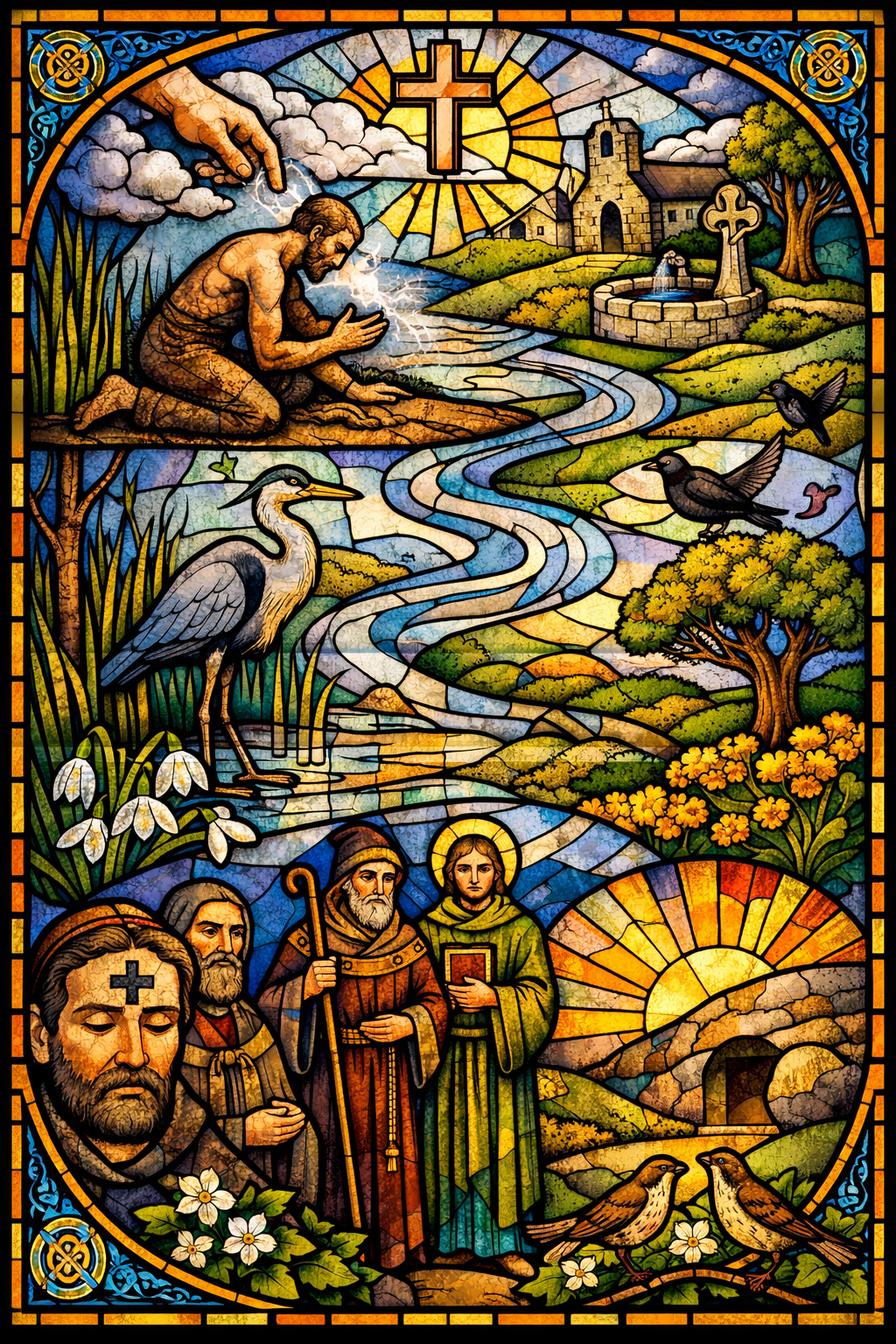 Stained glass window in Celtic style showing creation from dust, a heron by a winding river, Celtic saints with ash crosses, and an Easter sunrise over an empty tomb—framed in blue and gold