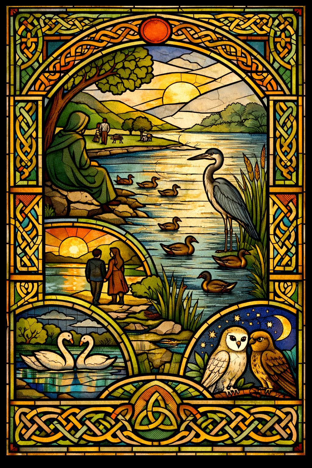 Stained-glass artwork in Celtic colours showing a lone heron standing at the edge of a calm lake, with mallards and coots drifting on golden water. A cloaked figure sits quietly on the bank beneath a tree, all framed by intricate green and gold knotwork.
