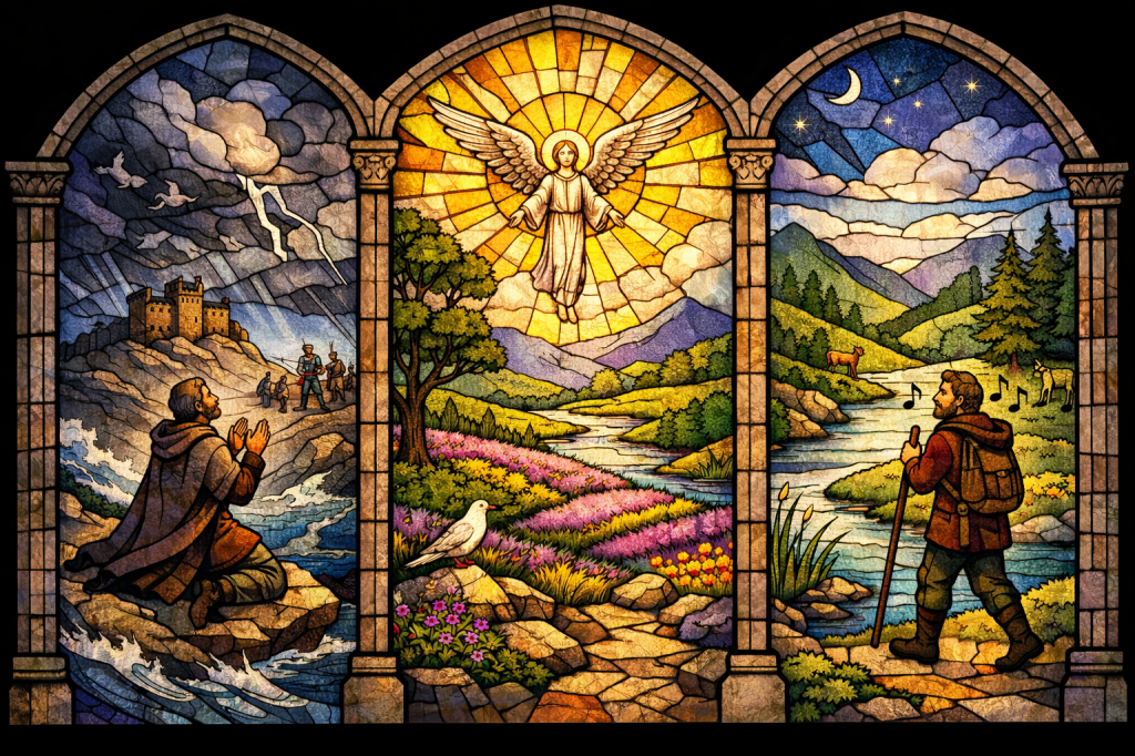 Triptych stained-glass window with three arched panels. In the left panel, a robed man kneels on rocks beside rushing water under dark storm clouds, praying as lightning splits the sky and armed figures stand in the distance. In the centre panel, a radiant angel with outstretched wings hovers above a peaceful river valley filled with flowers, trees, and golden sunlight streaming outward in bright glass rays. In the right panel, a traveler with a walking staff and pack stands beside a calm river under a crescent moon and stars, with mountains, trees, and deer nearby. The colours shift from stormy blues and greys on the left to warm gold in the center and tranquil blues and greens on the right, symbolizing distress, divine presence, and peaceful guidance.